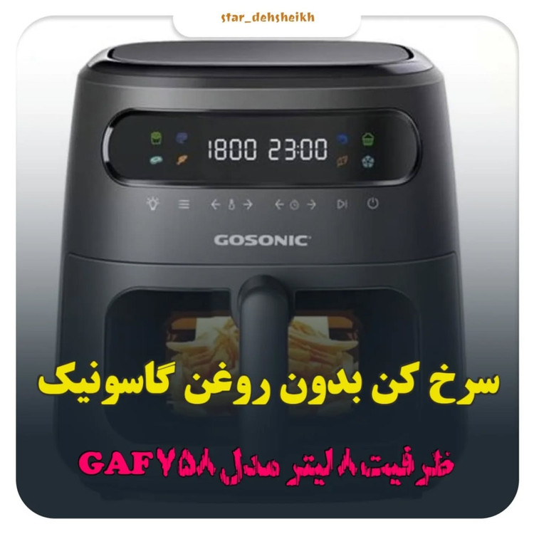 کارمندی یا خانم خانه دار با کلی مشغله هستی؟؟؟بیا تا یه محصول عالی برات معرفی کنم سرخ کن بدون روغن گوسونیک مدل GAF758 مشخصات فنی: وزن:۵۰۰۰گرم ظرفیت: حداکثر توان مصرفی:۱۷۵۰وات سیستم ایمنی:دکمه توقف عملیات توضیحات صفحه نمایش:صفحه لمسی طول سیم:۵۰سانتی متر سایر توضیحات توان مصرفی ۱۷۵۰ وات، گنجایش ۸ لیتر، تنظیم درجه حرارت تا ۲۰۰ درجه سانتیگراد، دارای ۸ برنامه پخت متنوع، تایمر ۶۰ دقیقه ای، پوشش داخلی نچسب جداشو و قابل شستشو، دارای لامپ داخلی، تنظیمات لمسی ،ظرف سرخ کن با طراحی جدید که پخت و پز مواد غذایی قابل مشاهده میباشد با احترام:3,300 عمده متفاوت می باشد ثبت از طریق ادامه توضيحات کالا در اولین کامنت.